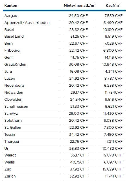Dank der hohen Kaufkraft der Löhne sind die Wohnkosten in der Schweiz im europäischen Vergleich nicht besonders teuer. Folgende Übersicht gibt anhand von 2 Beispielen einen Überblick über die durchschnittlichen Wohnkosten ausgewählter Städte/Kantone.